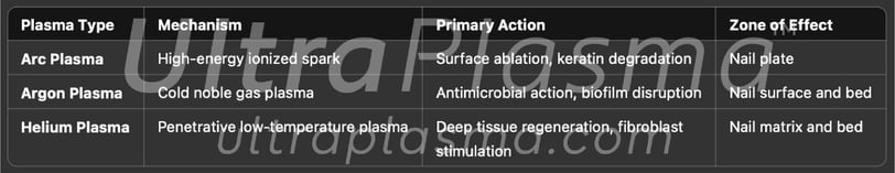 Onychomycosis (tinea unguium) is a prevalent fungal infection of the nail unit, often caused by dermatophytes, Candida species, and nondermatophytic molds. Traditional antifungal therapies suffer from long treatment durations, recurrence, and limited nail penetration. The UltraPlasma™ multi-platform plasma system—utilizing arc, argon, and helium plasma technologies—offers a novel, non-invasive treatment modality. This review details the mechanism of UltraPlasma™ in fungal nail infections, emphasizing its interaction with nail layers, pathogen types, and the biochemical activity of generated reactive gases such as ozone (O₃), nitric oxide (NO), and reactive oxygen/nitrogen species (RONS). Figures illustrate emission spectra, cross-sectional nail penetration, gas interactions, and clinical progress. The integration of photothermal, photochemical, and bioelectric effects renders this method an effective solution for resistant or recurrent onychomycosis.