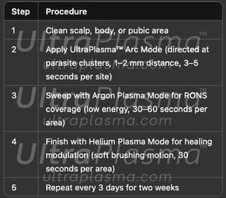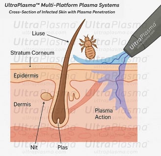 Pediculosis, caused by Pediculus humanus capitis (head lice), Pediculus humanus corporis (body lice), and Phthirus pubis (pubic lice), remains a widespread public health issue globally. Traditional chemical treatments have faced challenges due to increasing resistance and skin toxicity. UltraPlasma™ multi-platform plasma systems — integrating arc plasma, argon plasma, and helium plasma technologies — offer a novel, non-chemical approach to eradicate lice and their nits while promoting scalp and skin healing. Plasma-induced reactive oxygen and nitrogen species (RONS), including ozone (O₃), nitric oxide (NO), and singlet oxygen (¹O₂), play a pivotal role in parasitic destruction, inflammation modulation, and tissue regeneration. This article comprehensively reviews the mechanisms of action, skin layer interactions, and clinical implications of UltraPlasma™ treatment in pediculosis management.