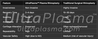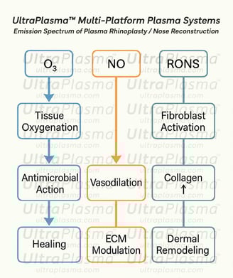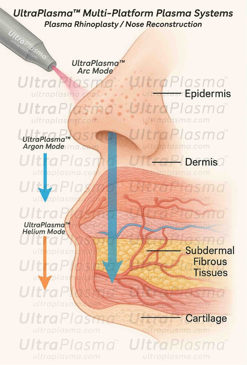 UltraPlasma™ rhinoplasty represents a revolutionary, minimally invasive technique for reshaping and lifting the nasal structure. Utilizing UltraPlasma™ multi-platform plasma systems, which integrate arc plasma, argon plasma, and helium plasma, this method offers precise energy delivery to superficial and deep nasal tissues. This article explores the underlying biophysics, skin and cartilage response, and gas-mediated biochemical pathways, with a special focus on ozone (O₃), nitric oxide (NO), and reactive oxygen/nitrogen species (RONS). A comparative analysis with conventional surgical techniques is also presented. Figures illustrate cross-sectional tissue effects, gas interactions, and histological changes.